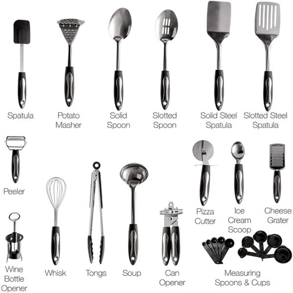 Whisk, Spatula, Tongs, Cheese grater, Pizza cutter, Peeler, Can opener, Ice cream spoon, Wine opener, and Measuring spoons